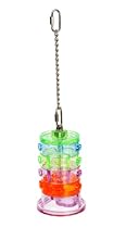 Encourages the natural instincts of a bird to forage for its food. Easy to load treat compartment allows you to hide a treat inside. Birds must turn each ring to drop the treat level by level until it reaches the treat opening. Made of tough polycarbonate. Zinc free nickel-plated chain.